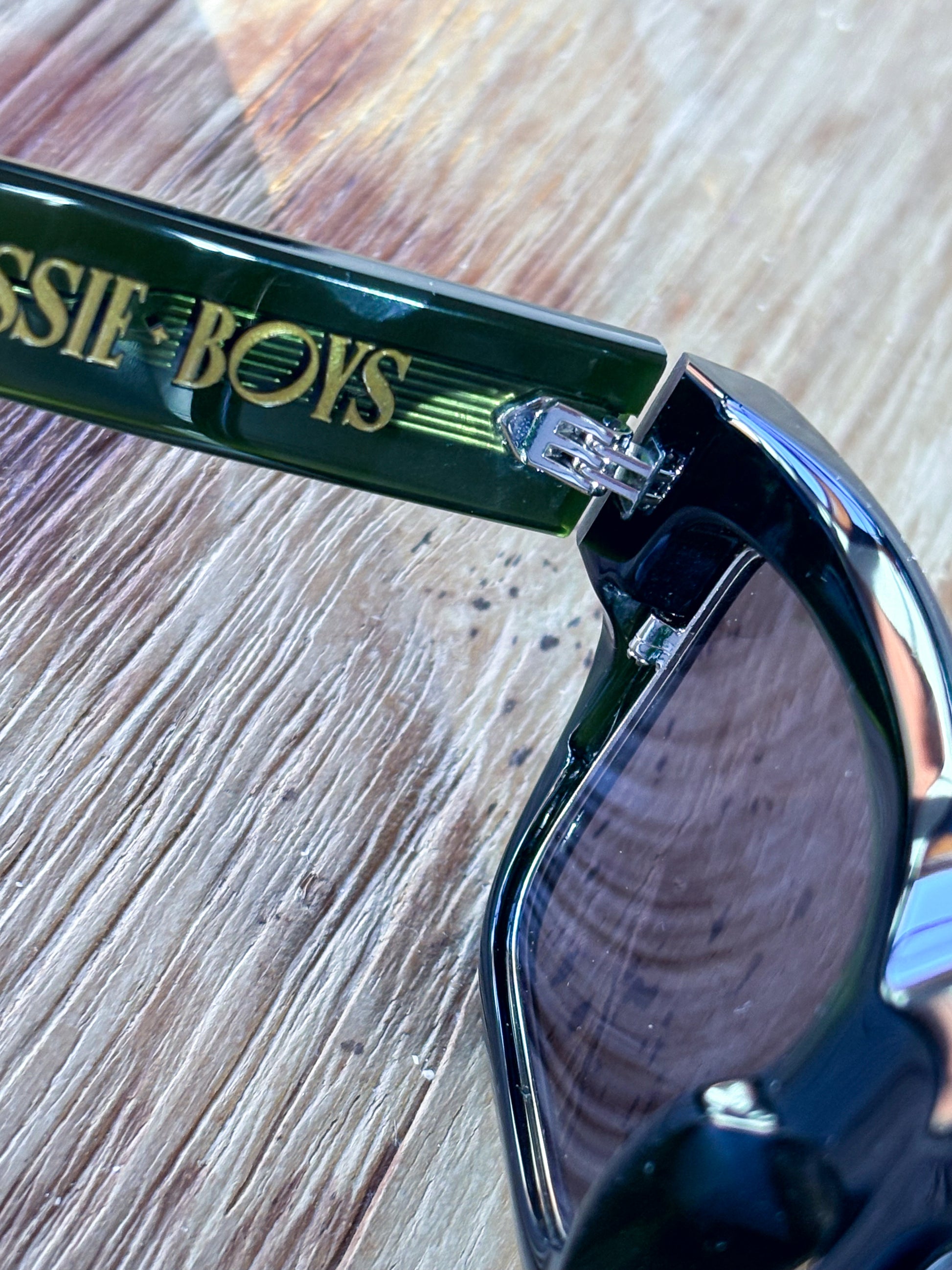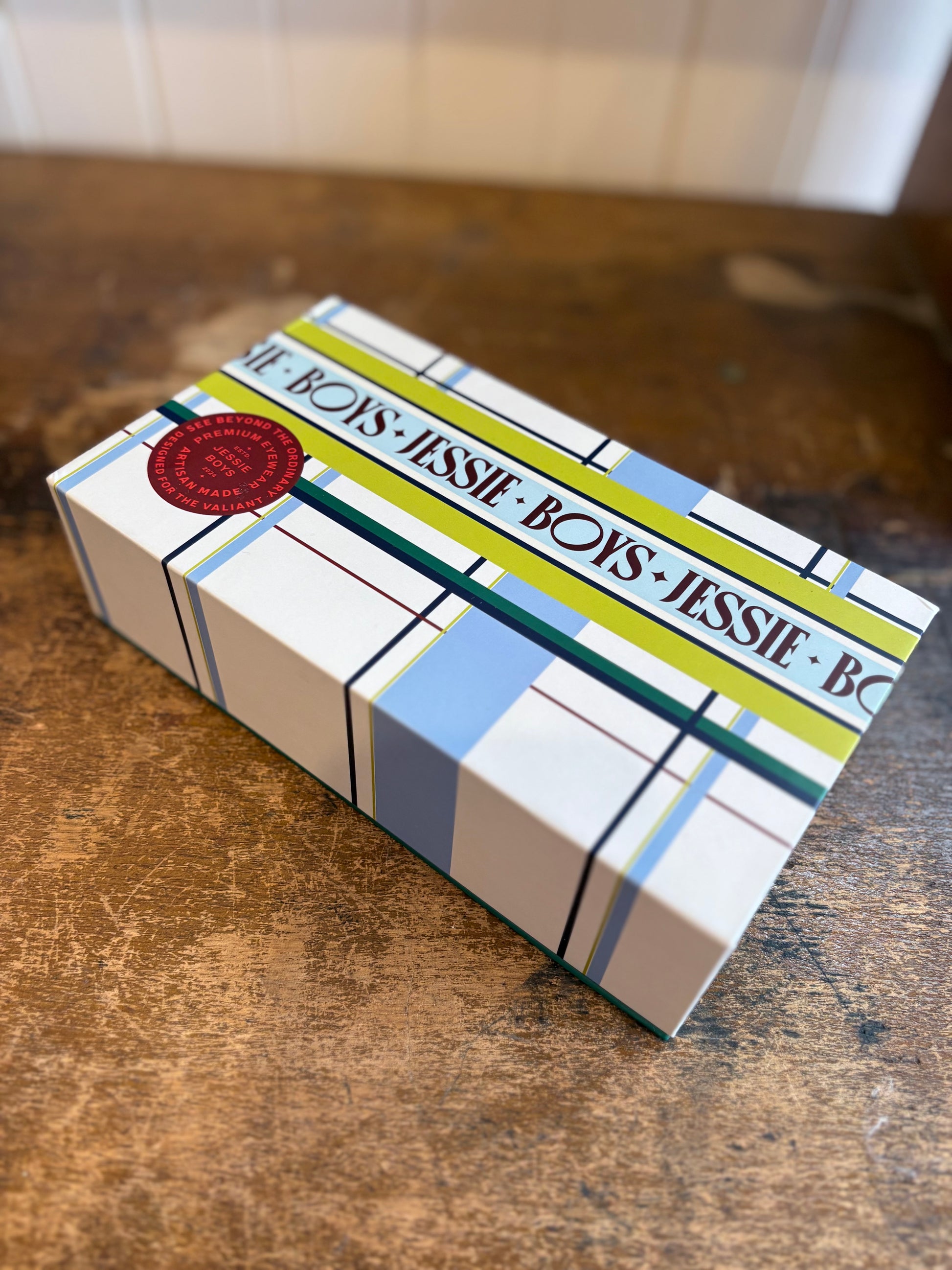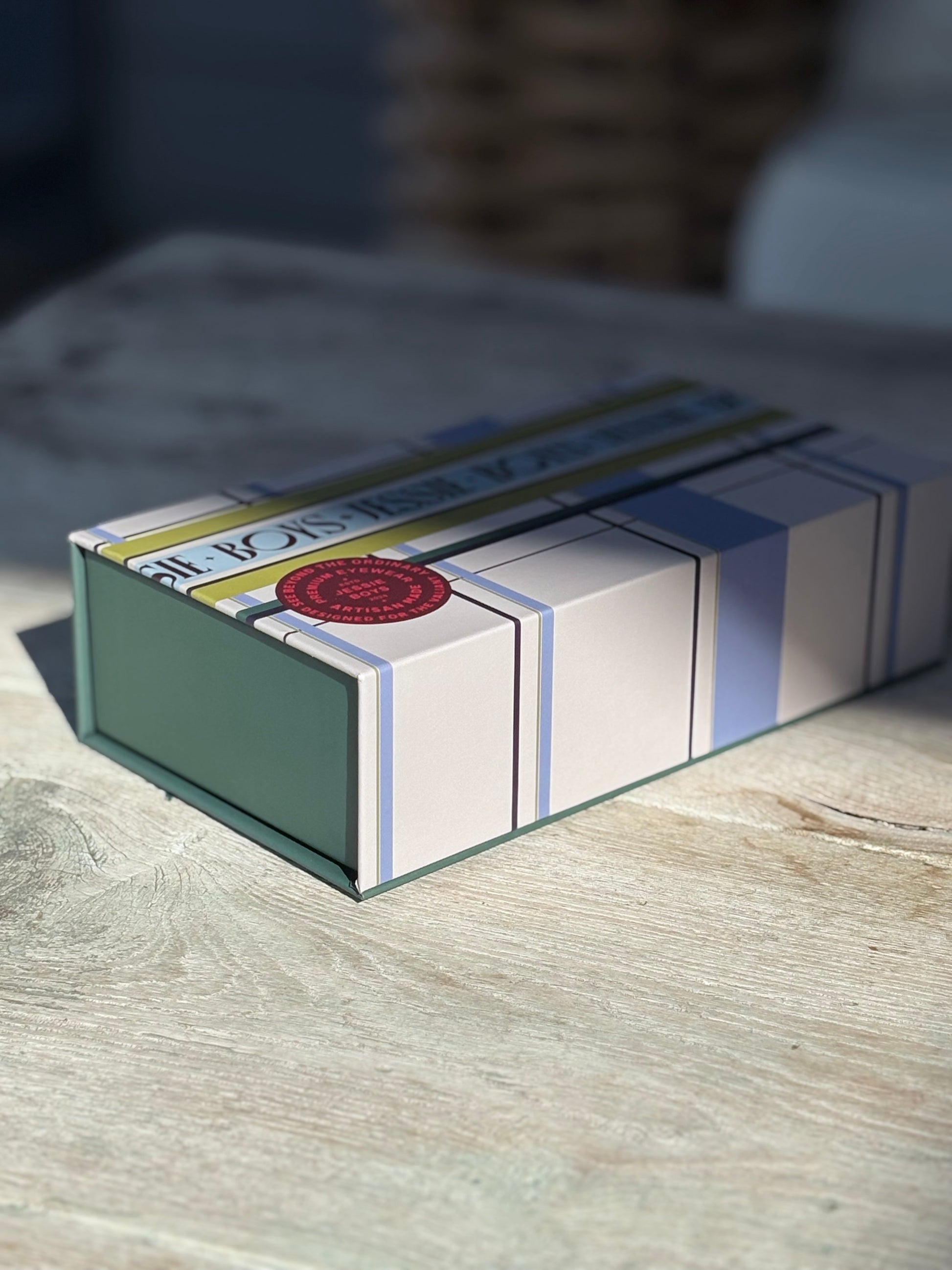 Hand finished in premium acetate with gold Jessie Boys insignia, each colour way carries its own personality.